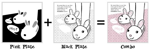 The image above is an actual example of the color separation plates that we made for Isabella’s Shoe Studio. I created 2 separate plates in grayscale mode for every image in the book: a pink plate that showed the printer where to put the pink ink, and a black plate for the black ink.